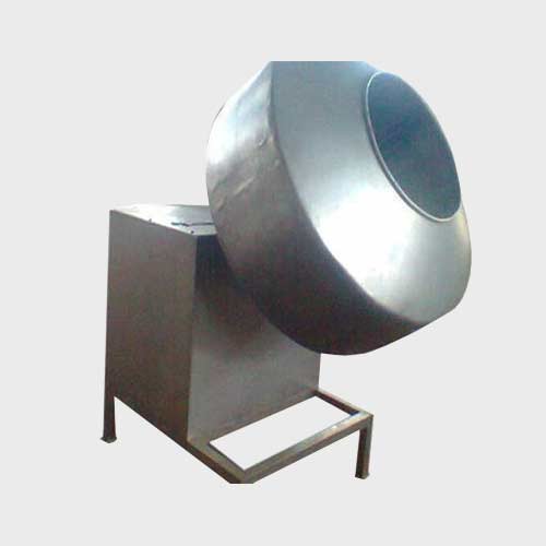 Stainless steel 304 semi ellipsoidal size pan with a circular mouth for charging and discharging of fried food products pan mounted at an inclination of 45 degrees to the horizontal. Suitable TEFC motor with suitable worm reduction gear box and pulley arrangement for rotating coating pan. The motor and gear box is mounted inside sturdy mild steel frame and the pan mounted on the gearing housing fitted in the stand. All joints argon arc welded and all stainless steel parts polished to suitable finished required of food processing equipment mild steel parts automotive painted to smooth finish.