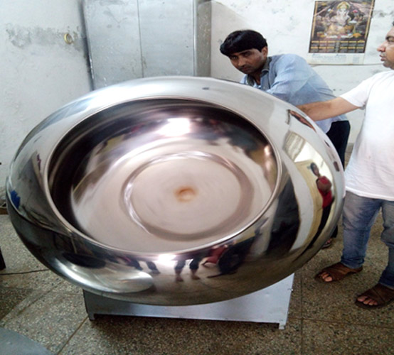 Stainless steel 304 semi ellipsoidal size pan with a circular mouth for charging fried food products pan mounted at an inclination of 45 degrees to the horizontal. Suitable totally enclosed fan cooled motor with suitable worm reduction gear box and pulley arrangement for rotating coating pan. The motor and gear box is mounted inside sturdy mild steel frame and the pan mounted on the gearing housing fitted in the stand. All joints argon arc welded and all stainless steel parts polished to suitable finished required of food processing equipment mild steel parts automotive painted to smooth finish.